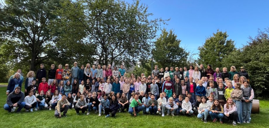 Beim gemeinsamen Fototermin sollten die Schülerinnen und Schüler laut herausrufen, in welcher Klasse sie sind. 129 Fünfer plus die Klassenlehrerteams ergab ein Riesengeschrei!