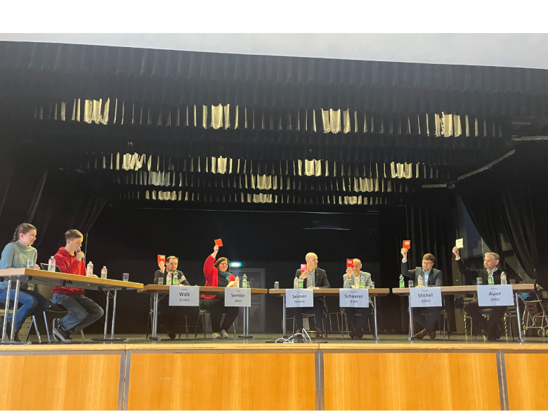 Mit Blick auf die Landtagswahl in Baden-Württemberg, bei der erstmals auch 16- und 17-Jährige wählen dürfen, saßen Vertreter aller größeren Parteien auf dem Podium: Peter Seimer (Grüne), Hans Dieter Scheerer (FDP), Farina Semler (SPD), Thomas Walz (Die Linke), Albrecht Stickel (CDU) und Andreas Auer (AfD). Moderiert wurde die Veranstaltung von Friederike Kocher und Aaron Ludwig, die die Diskussion strukturiert und souverän lenkten.